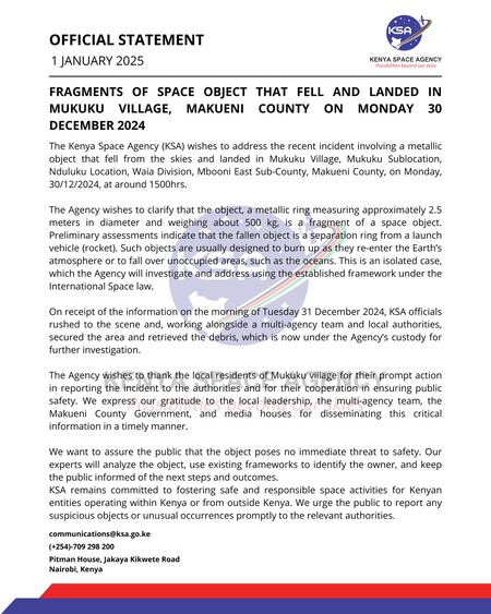 Apenas 48 horas después de que se recogieran los restos, la Agencia Espacial de Kenia emitió un comunicado inicial. En su comunicado de 1 de enero de 2025La agencia afirmó que, según evaluaciones preliminares, la pieza corresponde a un fragmento de un objeto espacial, más precisamente uno Anillo de separación del vehículo de lanzamiento.. Fue una conclusión relevante, pero parcial. La agencia no vinculó el objeto con un misil específico y describió el incidente como aislado. Al mismo tiempo, anunció el inicio de una investigación dentro del marco legal internacional que regula las actividades en el espacio ultraterrestre.