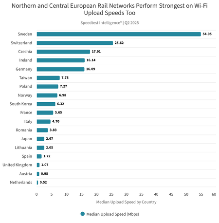 Velocidad media de subida en los trenes europeos. Imagen: Ookla