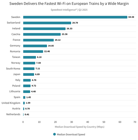 En Suiza el modelo es diferente pero eficaz. Este país, que ocupa el segundo lugar según el ranking de Ookla, tiene una estructura diferente. Y en lugar de WiFi universal a bordo, el operador SBB ofrece “FreeSurf”, un sistema que permite a los pasajeros con una SIM suiza utilizar datos móviles sin gastar su tarifa durante el viaje. Las balizas Bluetooth instaladas en los vagones detectan el dispositivo y el operador del tren cubre los costes con las empresas de telecomunicaciones. Esto evita el cuello de botella del Wi-Fi compartido y permite centrar las inversiones en mejorar la capa de red celular en los corredores. El problema es que sólo funciona para residentes con tarjeta SIM local.