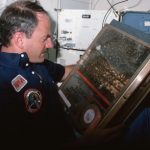 El astronauta James D. “Ox” Van Hoften investiga un experimento con abejas