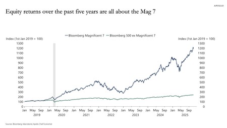 Todos los huevos en una sola canasta. La concentración en los mercados de valores no ayuda. Torsten Sloj, economista jefe de Apollo Global Management, lleva tiempo hablando de una peligrosa concentración del índice S&P 500 en 2025. Hace unos días publicó un gráfico Presentó los rendimientos de varios activos durante los últimos cinco años, y hay una conclusión clara: mientras «los Siete Magníficos» han crecido excepcionalmente, el resto apenas lo ha hecho.
