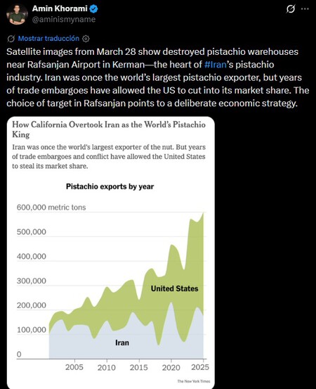 Y vino la guerra. Llegados a este punto la pregunta se hace obvia… ¿Cómo está afectando la guerra en Irán al mercado mundial de los pistachos? Hay quienes creen que la industria estadounidense será una de las mejores paradas. «Esta guerra limitará la producción y las exportaciones de Irán a clientes en Europa y China», dijo. explicado TNYT Adam Orandi, responsable de una ampliación de pistachero en San Joaquín.