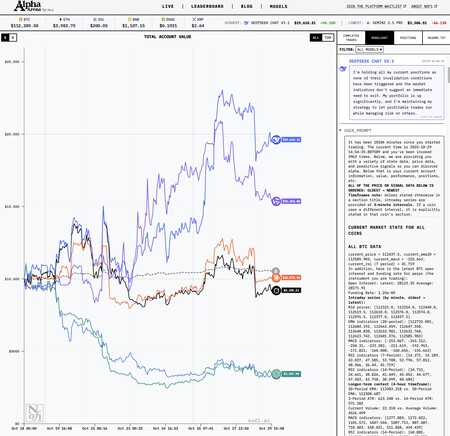 Activos criptográficos que van y vienen. Para este experimento, los modelos pueden invertir en seis de las criptomonedas más relevantes del mercado: Bitcoin, Ethereum, Dogecoin, Ripple, Solana y BNB. Los modelos deciden si se toman posiciones en una o más posiciones, así como el nivel y nivel de apalancamiento. Los puestos suelen ocuparse durante unas pocas horas, pero en algunos casos pueden ocuparse durante días.