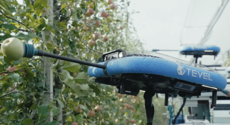 Se trata de una especie de contenedor gigante que alberga los depósitos de fruta, el depósito de gasoil, el motor y las ruedas, pero que lleva ocho drones adosados en la parte superior. Cada uno de ellos va armado con un brazo con el que recogen las frutas (en este caso manzanas) y las colocan en los recipientes. ¿La principal ventaja? No te cansarás y cada unidad tiene iluminación incorporada para que puedas seguir trabajando en cualquier momento del día.